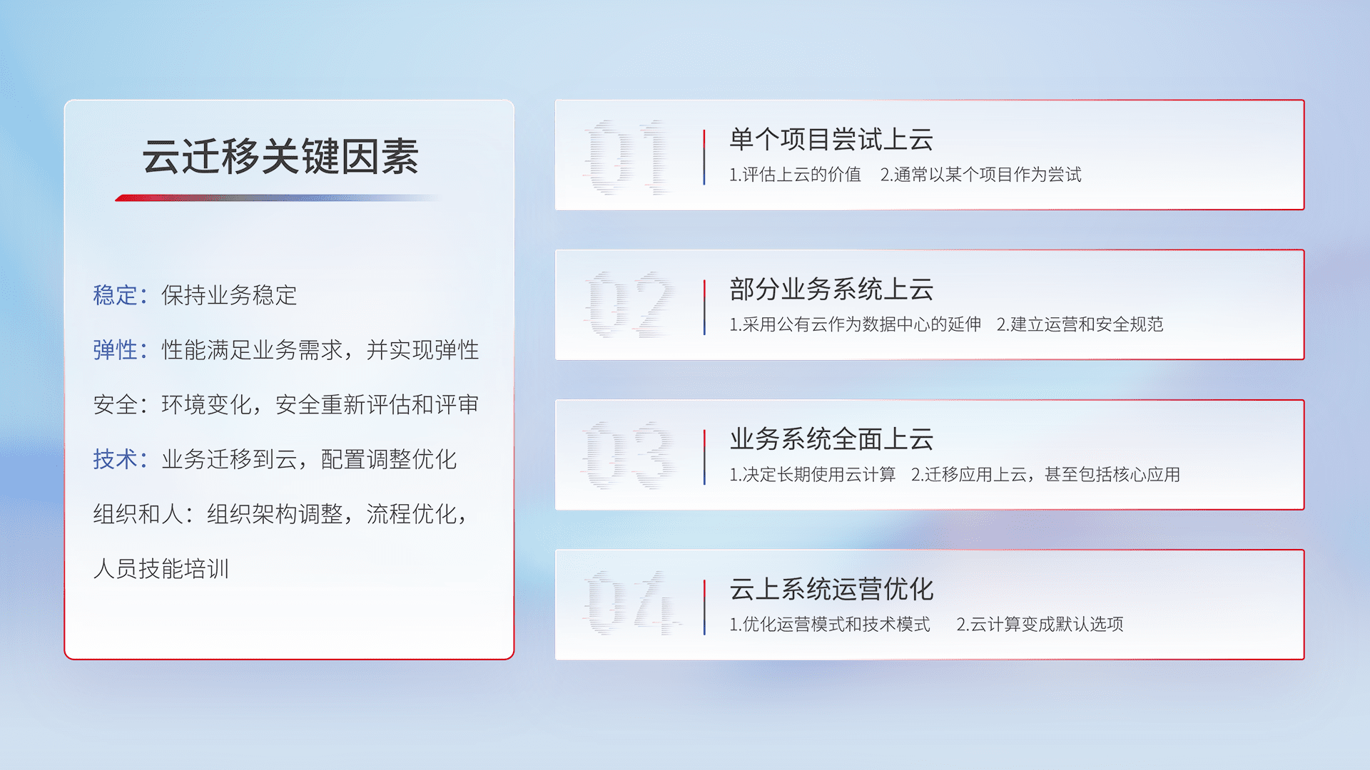 结合实际业务,,,,从规划设计、、、云平台选型、、云原生改造、、、数据迁移、、、、集成交付,,,迁移全过程为客户识别最佳上云路径,,做好风险识别管理,,设计网络架构、、身份权限、、、、安全审计合规、、、、操作审计、、、日志审计、、、监控告警策略、、、、多站点容灾设计等,,,,对云上基础设施进行整体规划,,提升IT治理水平,,以满足弹性、、、高可用、、、高性能的需求。。。