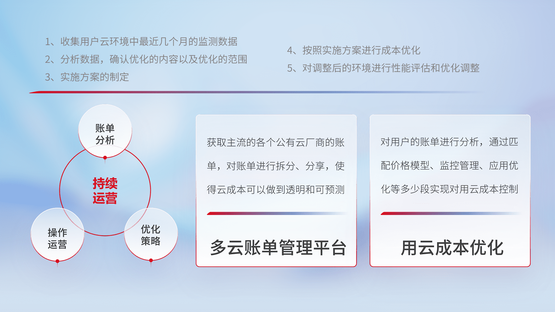 通过多云纳管,,以统一的资源数据模型把客户的云资源进行抽象和封装,,,进而实现对多云资源的统一操作,,,,保障云资源管理的可靠性、、、、稳定性与可用性。。。量身定制化运维内容,,,,配置、、、开发运维、、、补丁管理、、、备份、、、、监控、、认证和访问管理、、审计和日常巡检等,,,保障在用云过程中的可靠度,,,稳定度以及高可用率。。。。